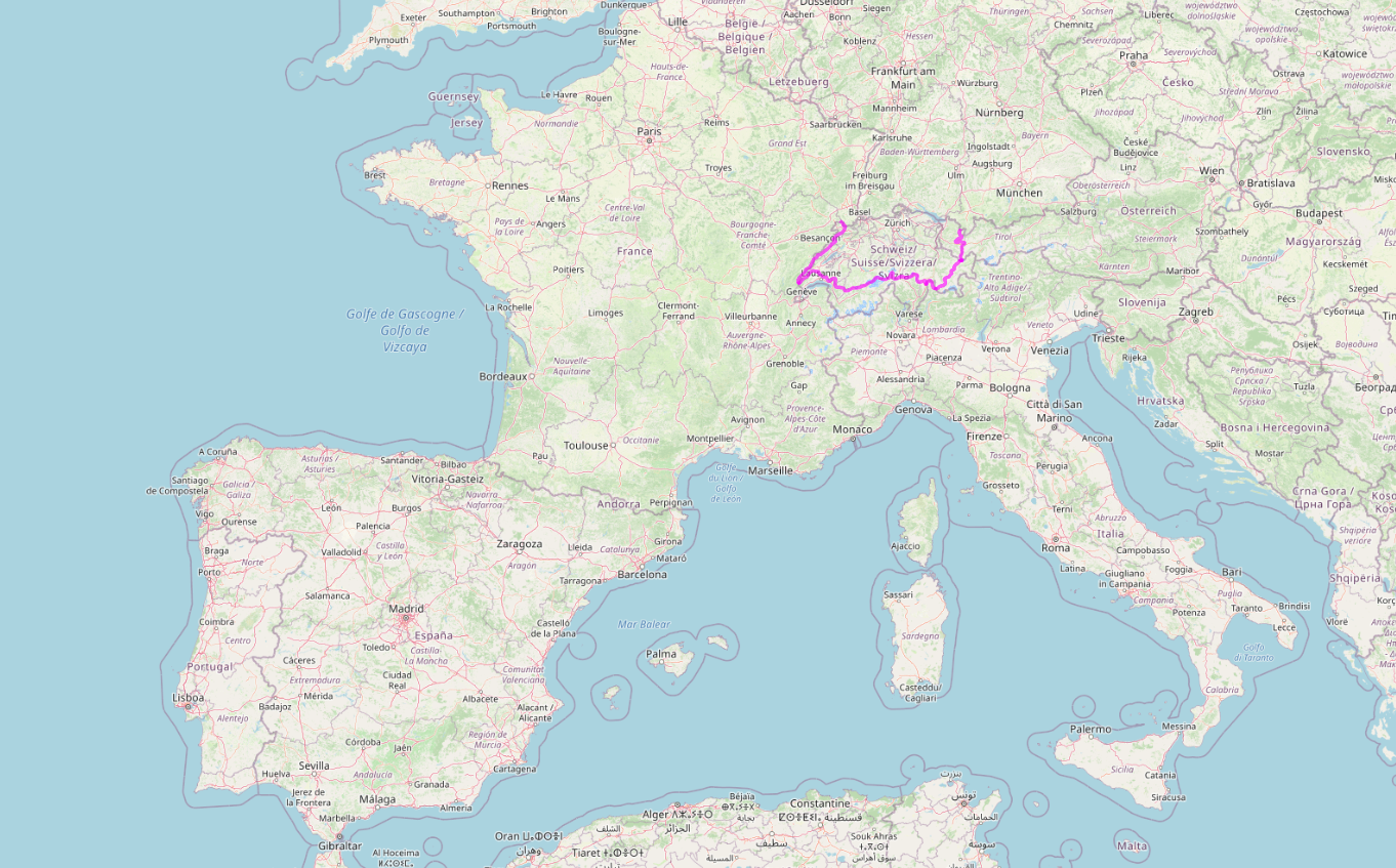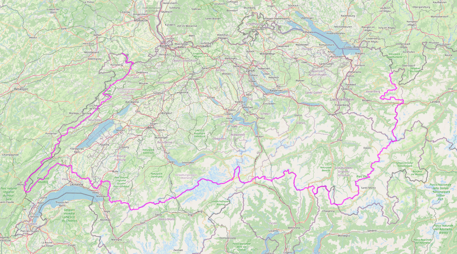알프스 대간은 스위스에서 이탈리아 국경을 걸치고 다시 스위스로 들어왔다가 오스트리아를 지나 독일과의 국경에서 끝난다. 알프스 산맥을 동서로 관통하는 그야말로 유럽의 지붕이라 할 수 있다.