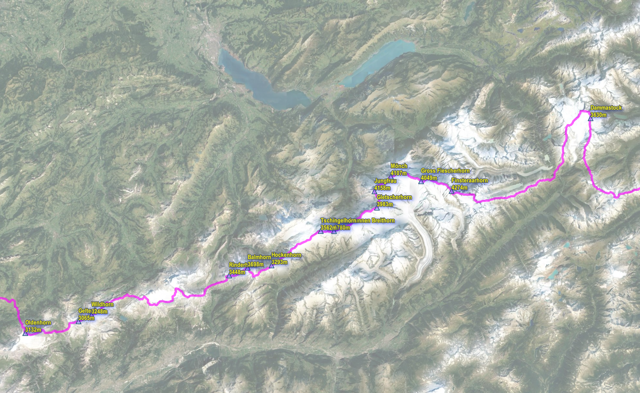 대간 중간을 지난 동쪽은 유명한 융플라우봉 등 4,000m급이 4개 있다.