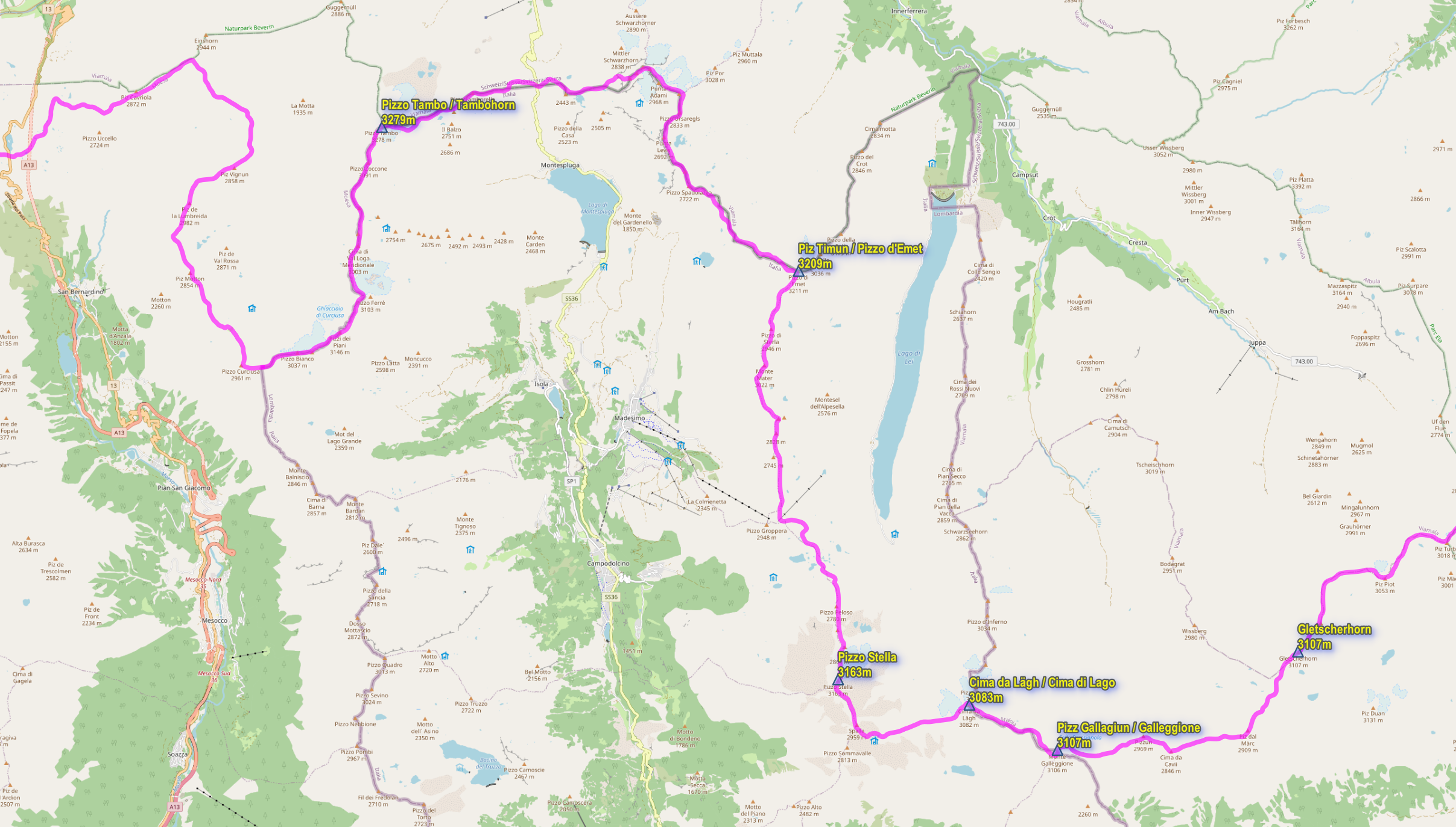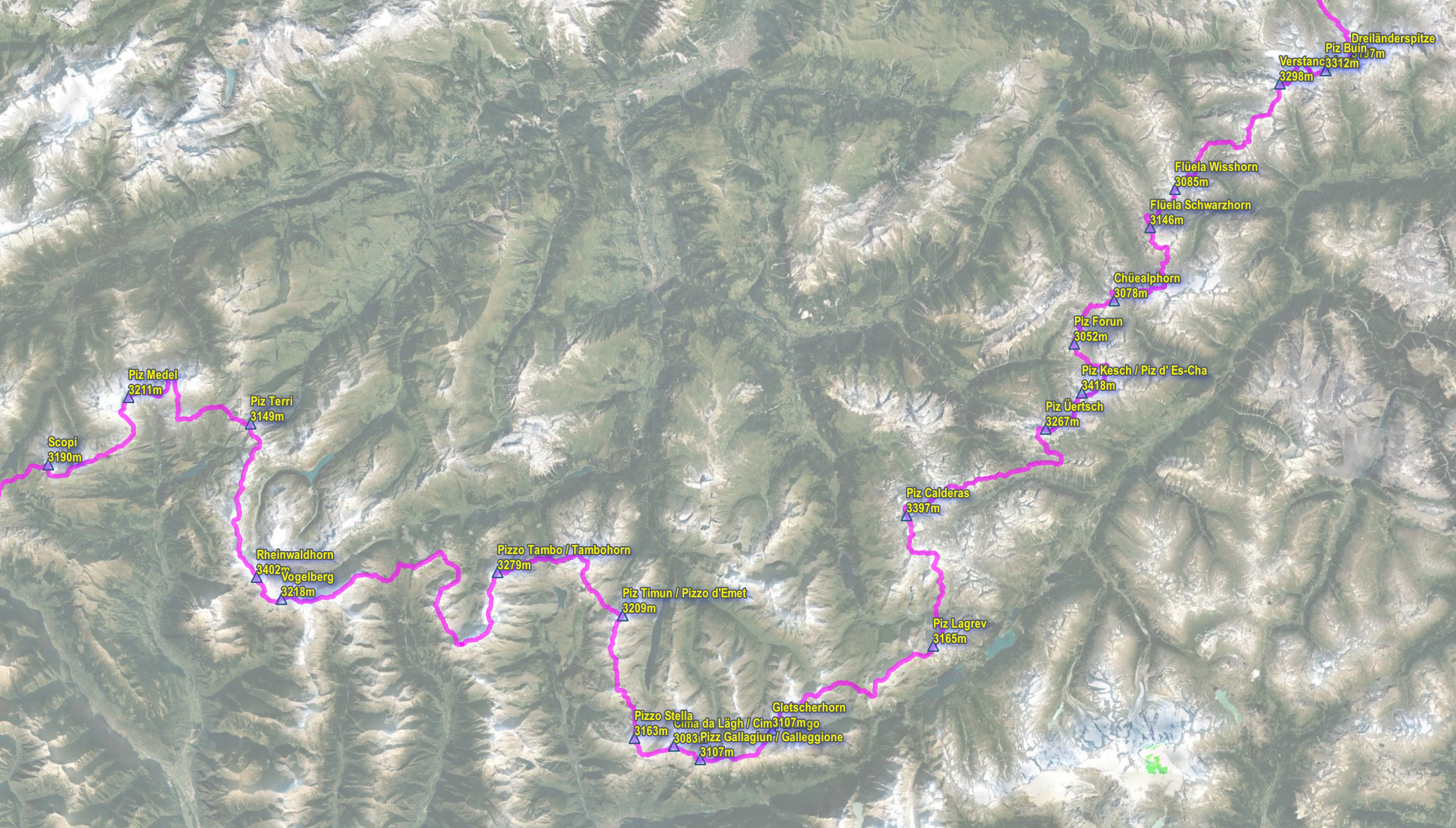 알프스 대간 중 해발 3,000m가 넘는 고봉들은 총 36개가 있으며, 그 중 5개는 이탈이아와 스위스 국경선에 그리고 2개는 오스트리아와 스위스 국경에 위치한다. 따라서 총 29개의 고봉들은 스위스 영토내에 있다.